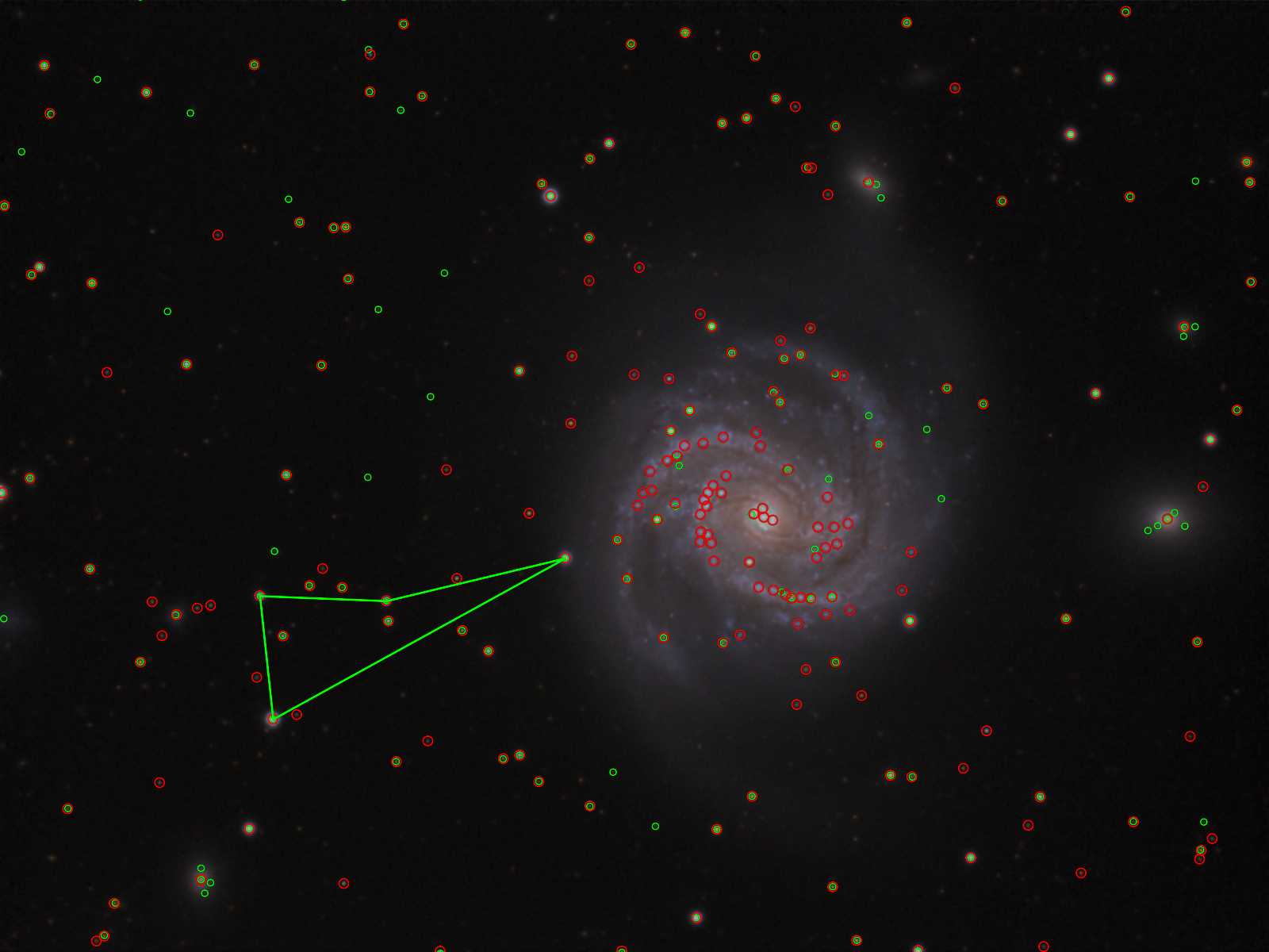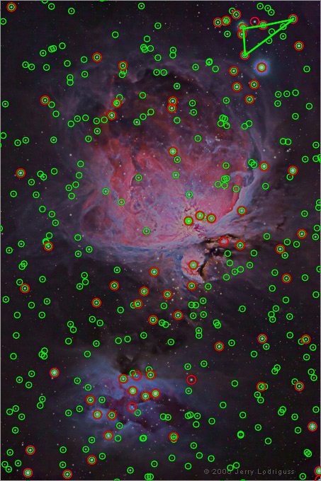In the images below, the red circles are stars our algorithm automatically detects in the image, and the green circles are stars from our master index which appear in the query image. Nebulae, constellations and other objects can be automatically overlayed on the image after it has been solved.